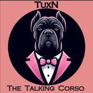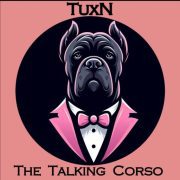 Tuxn Dog is a Cane Corso that speaks English using dog talking buttons. (Tawk’n Tux’n AI Dog Gizmos.)